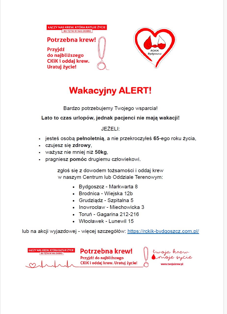 Oddawanie krwi to prosty sposób na uratowanie życia, a w okresie wakacyjnym zapotrzebowanie na krew jest jeszcze większe. Wiele osób wyjeżdża na wakacje, co powoduje, że liczba dawców spada. Każda kropla ma ogromne znaczenie Dołącz do grona tych, którzy niosą pomoc, i podziel się tym, co najcenniejsze. Razem możemy zrobić coś naprawdę wyjątkowego!